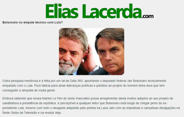 Nas palavras do notável Elias Lacerda, “é perceptível a qualquer leitor que Bolsonaro está longe de chegar perto do ex-presidente Lula”. Deixando claro que em 2018 sua preferência pode ser qualquer nome, menos o de Bolsonaro, o que é perfeitamente compreensivel no Estado Democrático de direito em que vivemos. Cada um tem suas opiniões e suas escolhas.